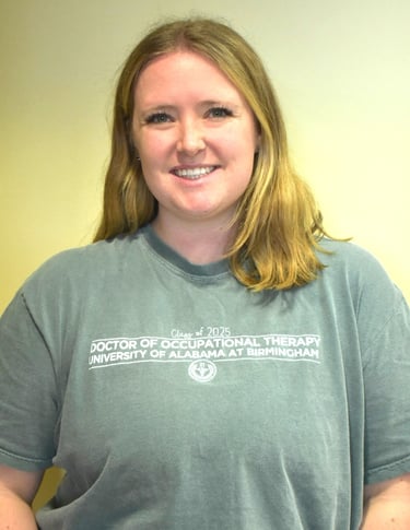 Her clinical experience includes fieldwork placements in pediatrics with GASLC, outpatient neurology OT at the Andrew C. Carlos Multiple Sclerosis Institute at the Shepherd Center, adult psychiatric support, brain injury rehabilitation, and community re-integration support for individuals experiencing homelessness.